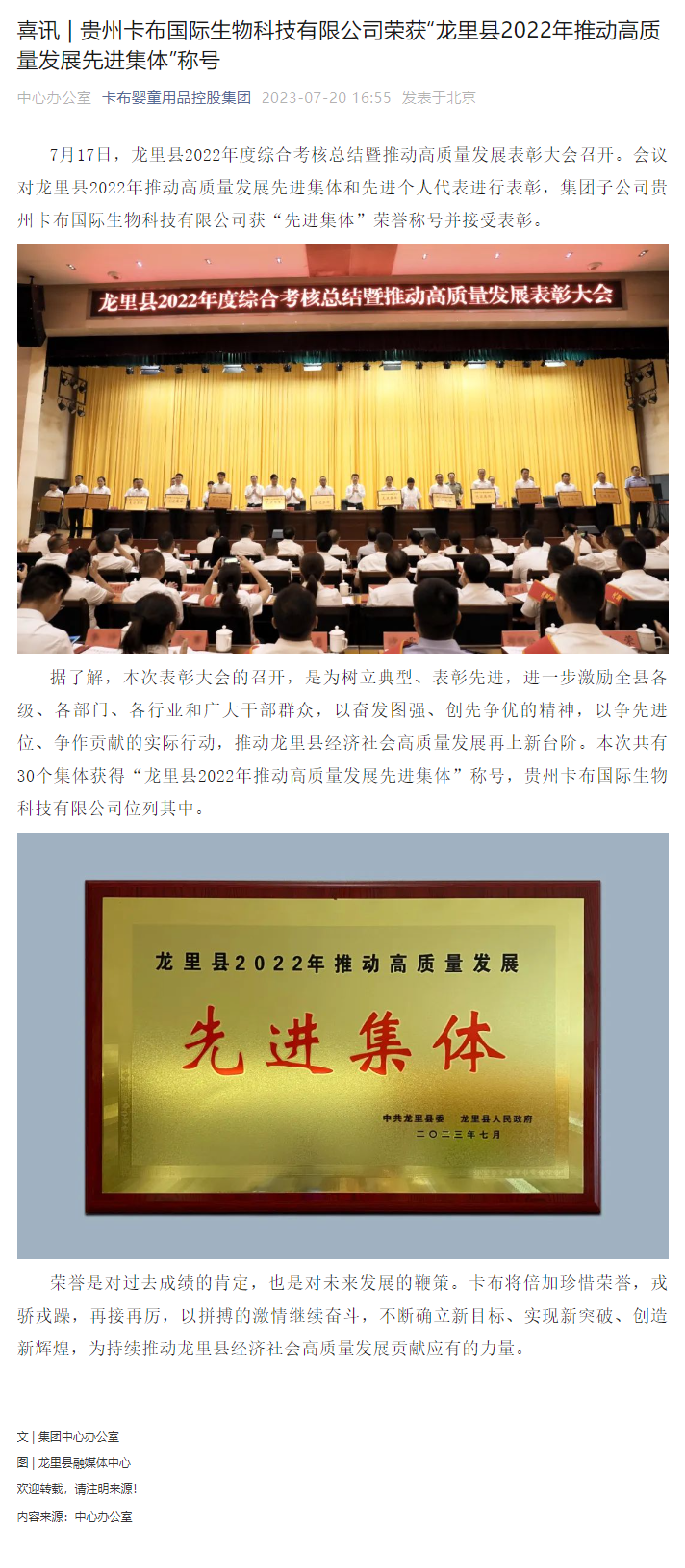 喜訊 | 貴州卡布國(guó)際生物科技有限公司榮獲“龍里縣2022年推動(dòng)高質(zhì)量發(fā)展先進(jìn)集體”稱(chēng)號(hào)